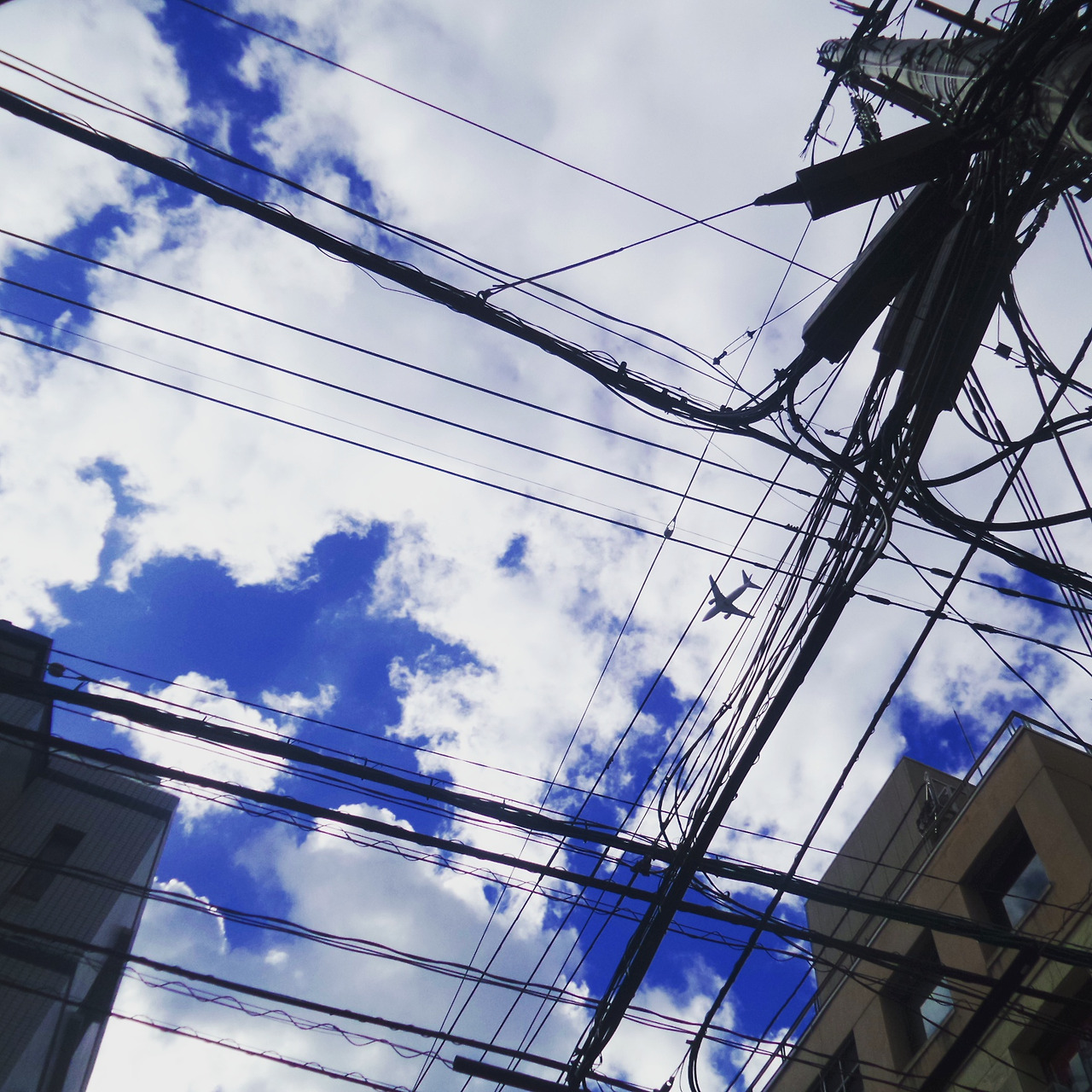 복잡한 전선 사이로 유유히 날아가는 비행기