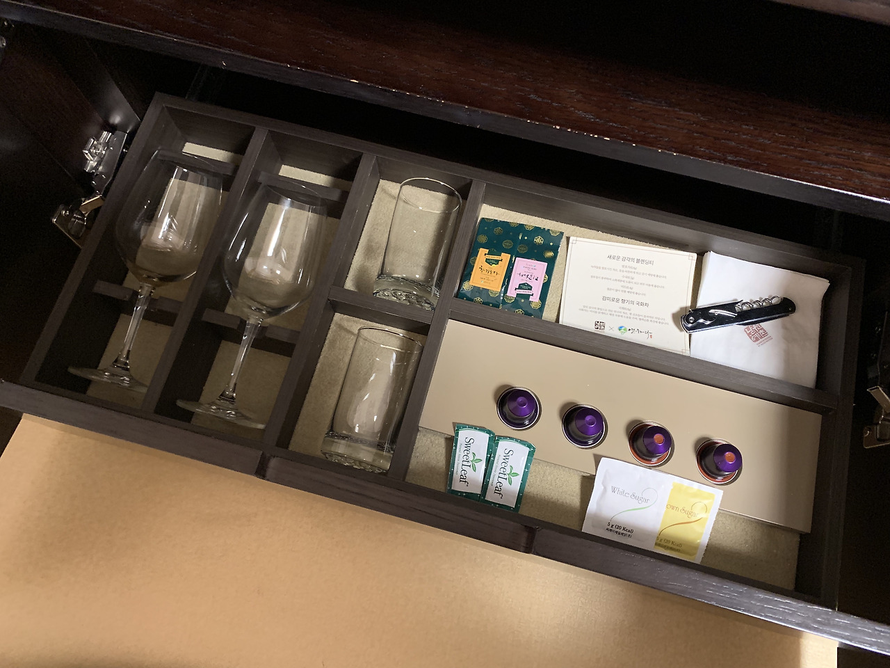 와인잔과 커피 캡슐 4개가 준비되어 있었다.