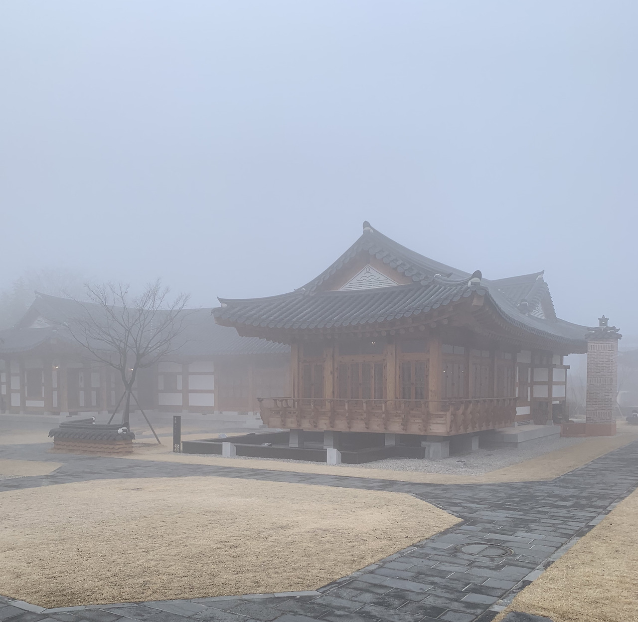 조식을 먹으러 나왔더니 안개가 자욱한데