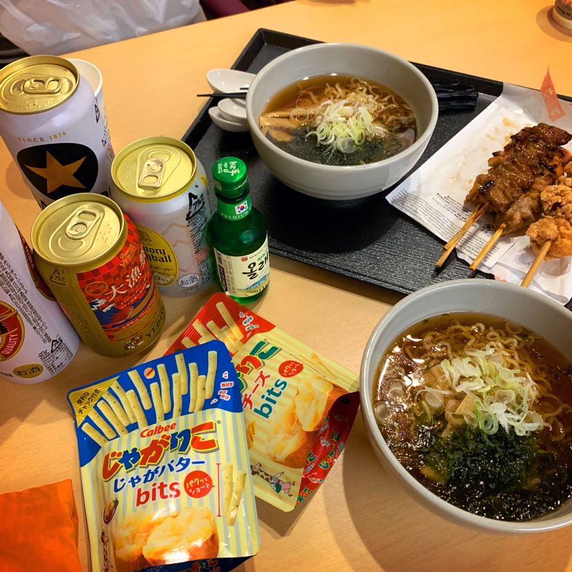 호텔 밑에 있는 편의점에 들러서 맥주와 과자와 닭꼬치 구매해왔어요.