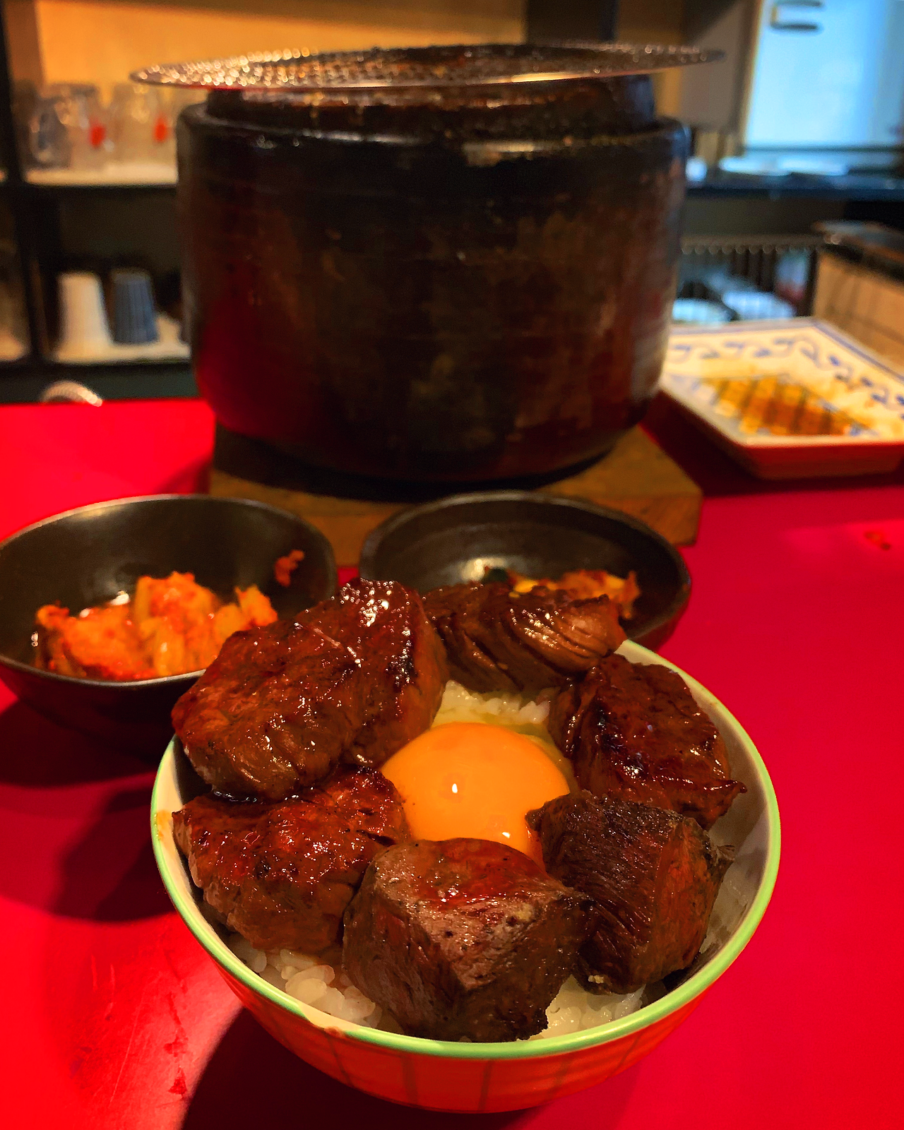 구운 살치살을 올리고 중간에 달걀노른자를 딱 올리면
