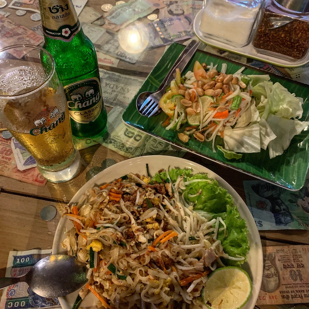 태국에 왔으니 먼저 쏨땀과 팟타이 그리고 창 맥주를 시켰어요.