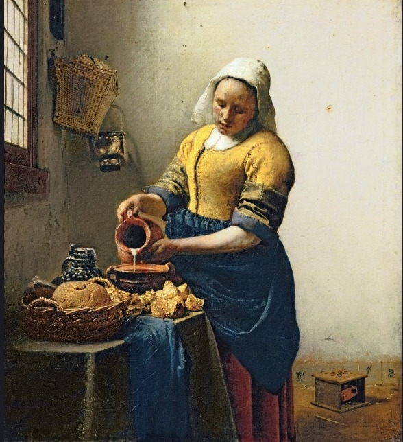 베르메르는 자신의 소묘에 정확성을 기하기 위해 '카메라 옵스큐라'를 사용하였습니다. 그는 단순히 투사된 영상을 베끼는 데 그치지 않고, 물감 사용법도 매우 혁신적인 방법으로 사용했습니다. 보통은 세부묘사에 치중한 부드러운 화필을 사용하였으나 때때로는 그림의 표면 위에 도드라지도록 점을 찍어 거칠고 진동하는 듯한 3차원적인 질감의 느낌과 함께 빛의 반사율을 돕도록 했습니다. 이를 '푸엥틸레'(pointillés) 라고 하는데요, 베르메르는 수백 개의 점을 엷게 칠해 빛을 표현해 내고 있는 것입니다. 빵의 질감이나 우유가 담겨있는 병입구쪽 묘사부분을 보면 잘 이해 할 수 있습니다.