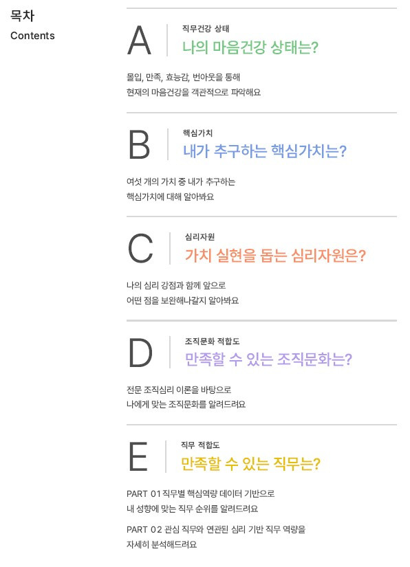 리포트는 마음 건강 상태, 나의 핵심가치, 심리자원으로 나의 특성을 이해하고, 그 특성이 잘 발휘될 수 있는 외부 자원(조직 문화·직무)까지 이어진다. 다른 직업적성 검사와의 차별점이 아닐까.