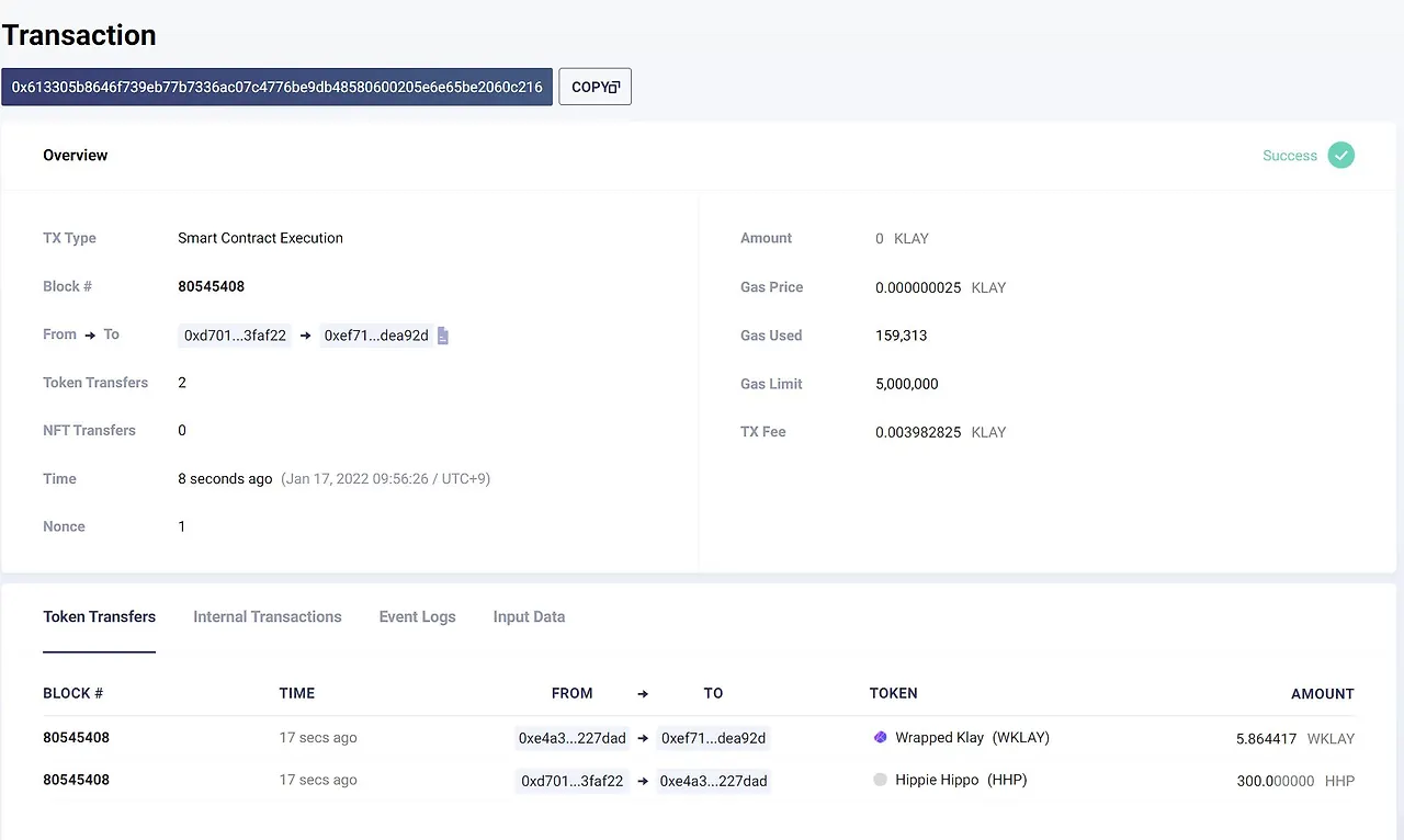 위에서 언급한 것처럼, 나를 포함한 힙크비 멤버들은 모두 일정한 양의 자체 토큰 (HHP)을 부여 받았다. 이 HHP 토큰을 내가 가진 카이카스(Kaikas)에 추가하고, 원하는 만큼 클레이(KLAY)로 스왑하는 걸 연습하는 게 또 하나의 과제였다.