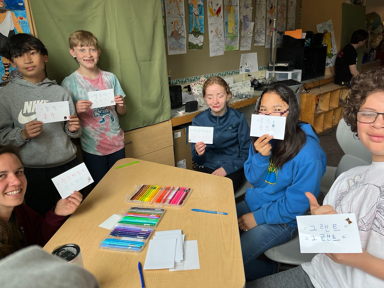 열심히 아이들 한글 이름 써주느라 K-pop코너와 한복 설명하는 케일리를 사진에 담지 못했다.
