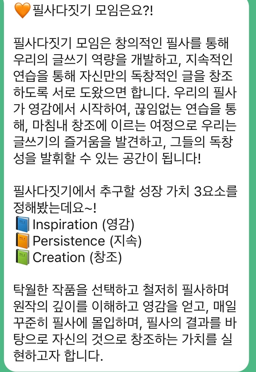 필사 그룹의 이름은 < 필사다짓기 >, 리더가 필사다짓기 모임에 대해 소개하는 글을 올렸다.