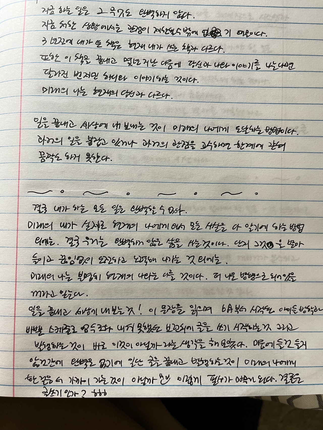 20일간 필사를 하면서, 저녁에 너무 잠이 와서 그냥 자고 싶은 적도 여러 번 있었지만 필사하며 잠시나마 생각을 정리해 볼 수 있는 정말 유익한 시간이었다.