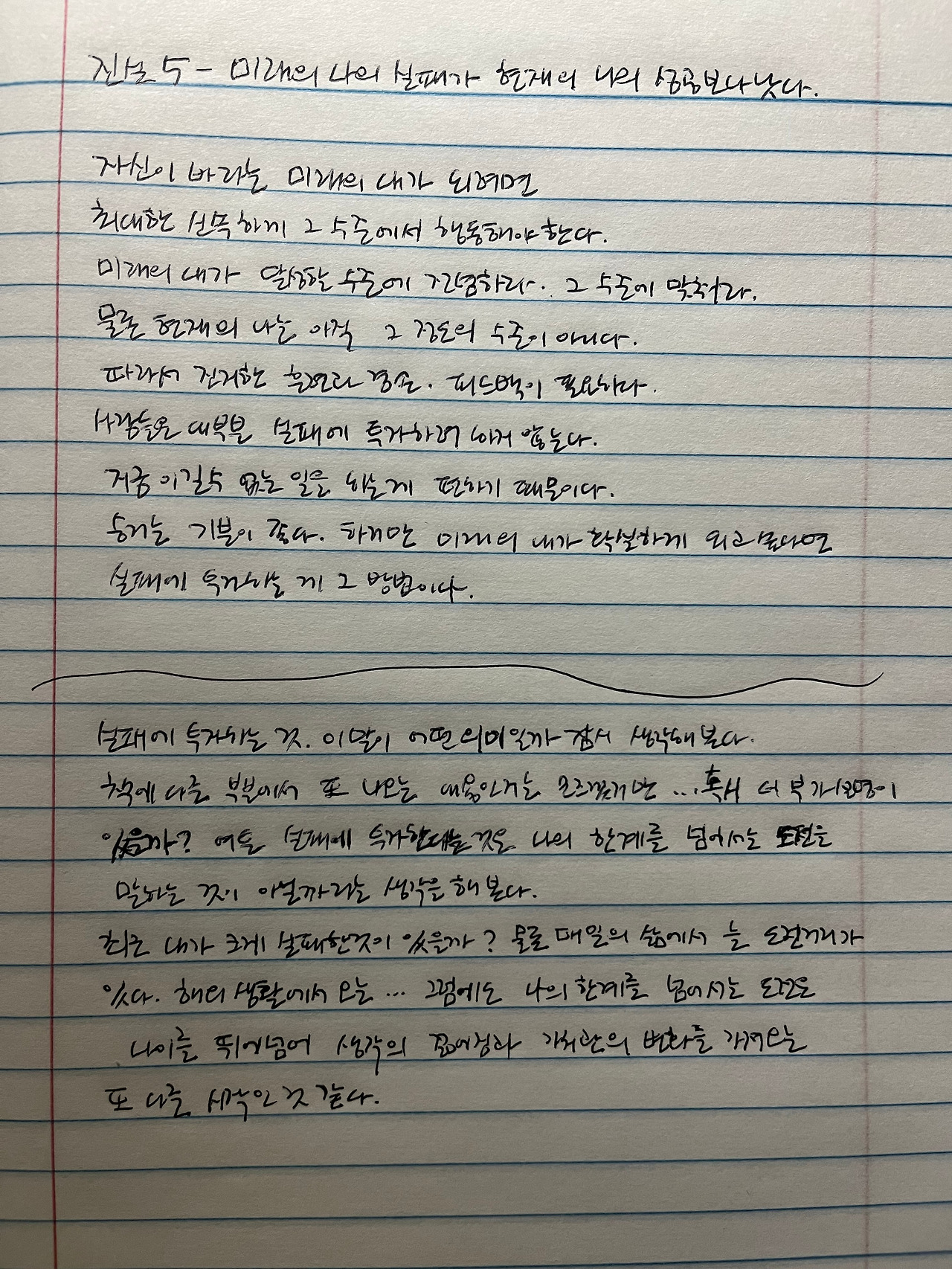 미래의 나는 분명히 현재의 나와는 다를 것이다. 더 나은 방향으로 되어 있을 꺼라고 믿는다.