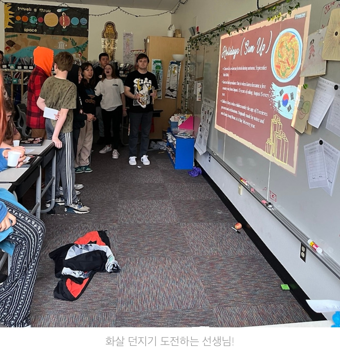 전통 놀이 코너에서는 제기차기와 화살 던지기를 했다. 먼저 고등학교 트랙 코치인 6학년 선생님이 제기차기에 야심 차게 도전했지만 결과는 아쉬웠다. 제기차기가 생각보다 쉽지 않았다.