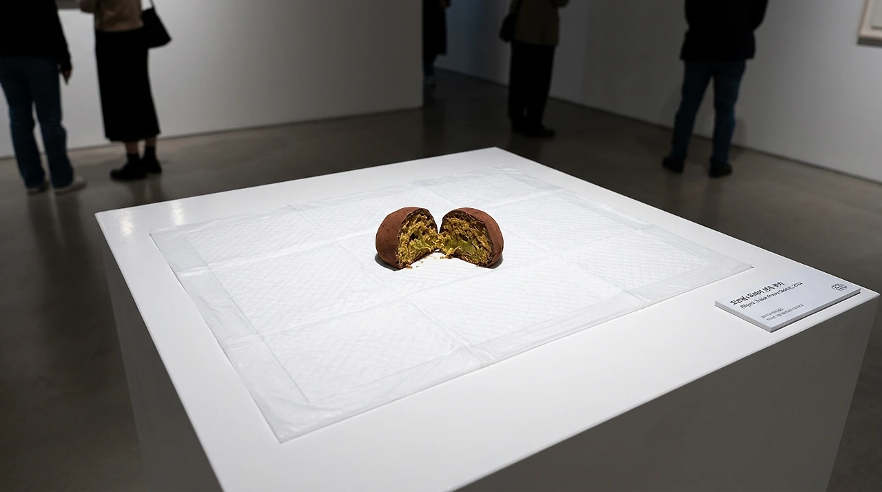 코미디언이자 유튜버 강유미가 현대 미술을 패러디한 영상에서 배변패드에 올린 두쫀쿠가 등장한다.