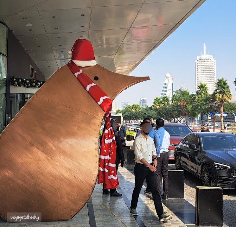 호텔 앞 귀엽지만 육중하고 비싸 보이는 거대한 청동새. 목도리와 모자를 쓴 것도 귀여웠다.
