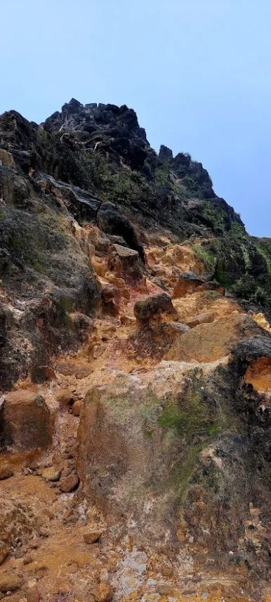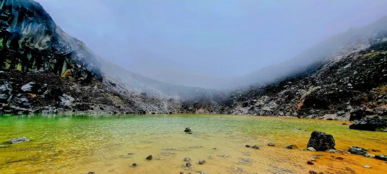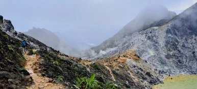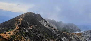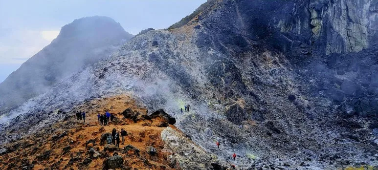 분화구 주변은 유황연기가 자욱하다. 썩은계란 유황냄새도 엄청 나는데 숨막힐 정도까지는 아니다