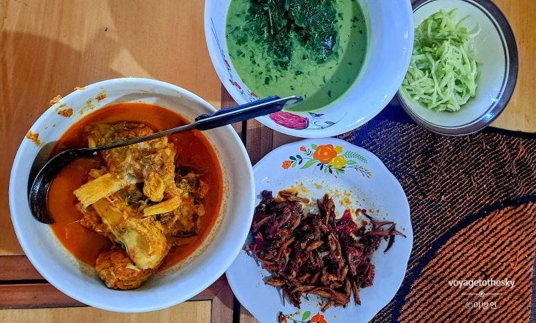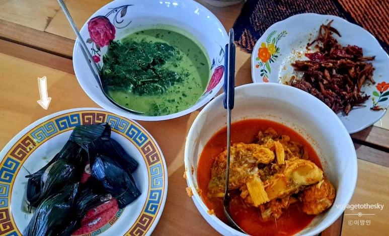 요 떡은 판단 잎으로 감싸고, 안에는 땅콩과 야자사탕으로 만든 소가 들어가있었는데... 그렇다. 송편하고 맛이 똑같았다. 옆의 생콩 같은것은 마늘과 두리안을 섞은 냄새가 났는데, 먹을수는 있었다 ㅋㅋㅋ