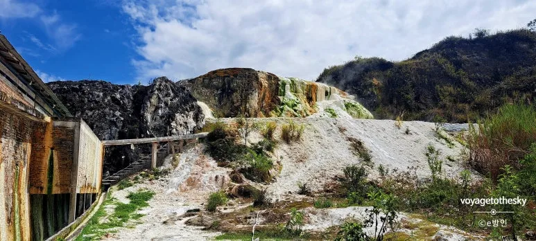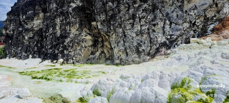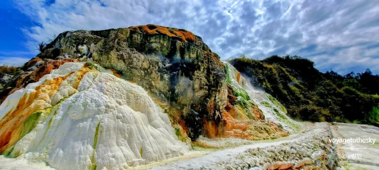 이 독특한 지형은 활성화산지대의 마그마가 지하수를 만나고, 석회암을 녹이며 지표로 솟아오르면서 만들어졌다. 다양한 색깔은 미네랄의 영향 - 흰색은 석회성분, 노란색과 주황색은 황(surfur)과 철(iron) 성분, 그리고 초록빛은 물 속의 조류(algae)