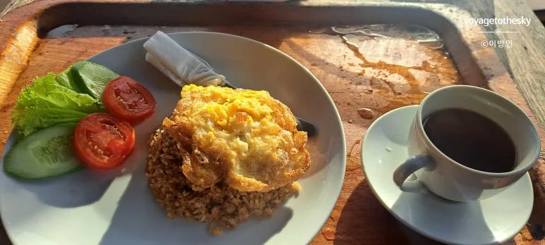 숙소의 아침메뉴는 나시고렝 or 샌드위치와 커피 or 차 중에서 선택이 가능하다. 전날 몇시에 아침을 먹을것인지 물어보고, 놀랍게도 방으로 직접 가져다준다.