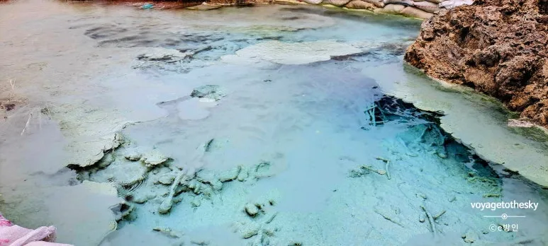 황 성분이 짙은 온천의 물은 저렇게 선명한 파란색 또는 하늘색을 띤다.