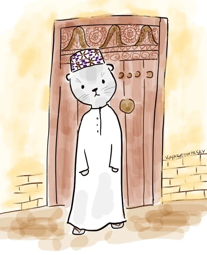 오만인들은은 평상복으로 전통의상을 입고다니는 경우가 많고, 오만남자들은 저 심플한 흰색 또는 파스텔톤의 긴 가운을 두르고 저 약통처럼(?) 생긴 섬세한 자수가 있는 모자를 쓰고다닌다.