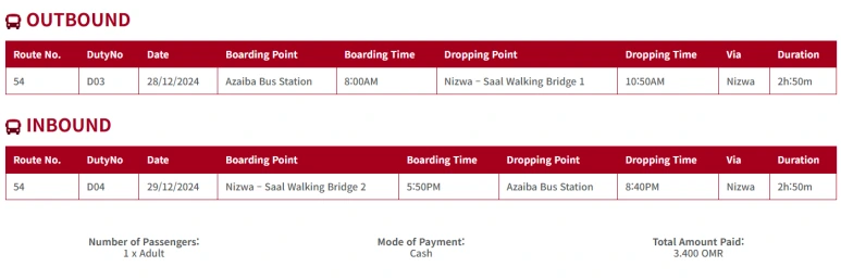 이동시간은 3시간 걸리고 버스표 가격은 편도 2.0 OMR (1오만리알 = 대략 4000원정도).