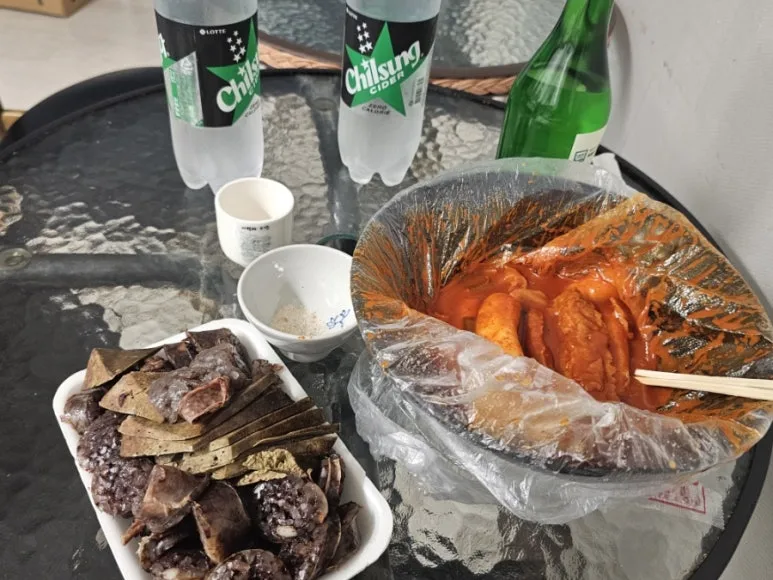 안동은 유독 늦게까지 영업하는 식당이 적었어요. 할수없이 시장에서 떡볶이와 순대, 그리고 안동소주를 사와서 호스텔 투숙객 & 스탭들한테 좀 나눠주면서 먹었습니다.