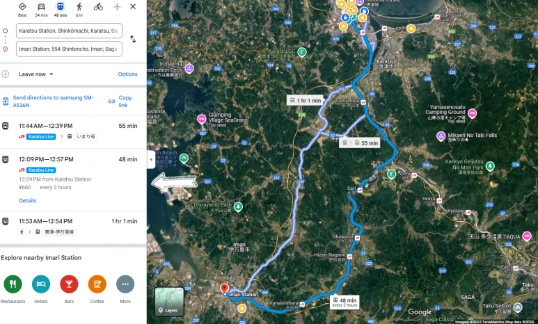 카라츠역에서 이마리역으로 가는 기차는 배차간격이 2시간이고, 12시9분에 있었다.