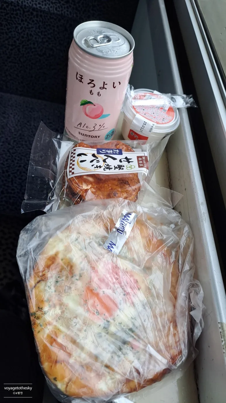 요렇게 간식을 먹었다. 알콜 3% 들어있지만 거의 음료수에 가까운 호로요이 복숭아맛, 센베 하나, 행인두부 (아몬드젤리), 그리고 얇은 피자빵으로... 피자빵은 맛있었고, 센베는 짜다.