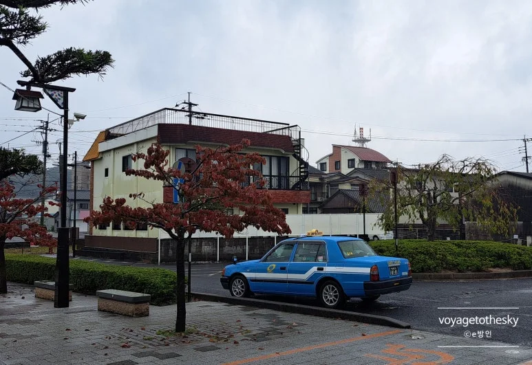 빨간 단풍과 조화를 이루는 파란 택시가 인상적인 시내로 나선다.