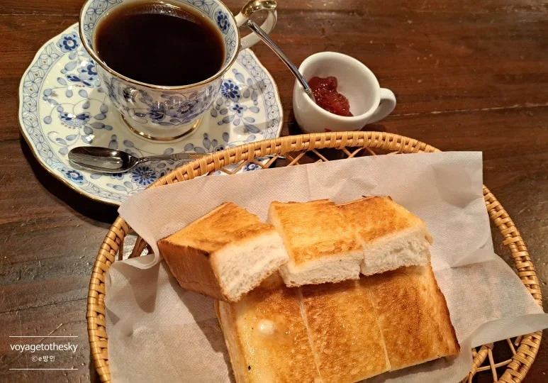 그런데, 이런 분위기의 빌드업 치고 맛이 엄청나게 뛰어난건 아니었다. 그래도 평소에 마시는 커피보단 훨씬 맛있었다. 버터를 바른 토스트는 그냥 아는 맛있는 맛.