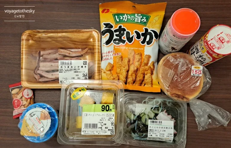 일단 옷과 신발의 물기를 최대한 짜내고, 뜨거운 물에 몸을 담그고 컨디션을 회복한 뒤, 마트에서 사온 술과 안주로 야식을 먹었다. 마트의 물가는 무척 저렴하다. 저 삶은 오징어와 해초샐러드는 짜지만 맛이 괜찮았다.