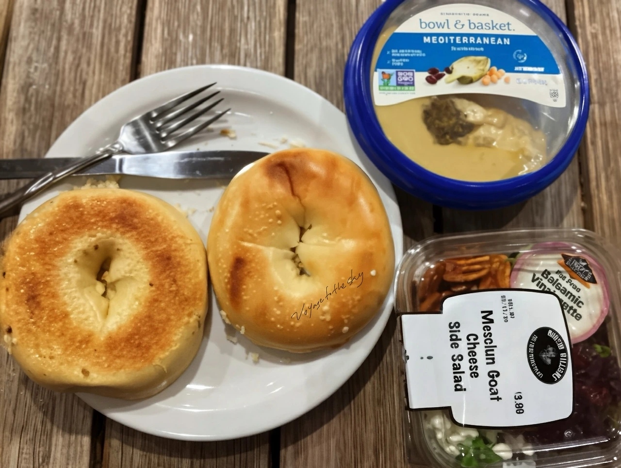 점심 스킵하고 저녁으로 고른 것은 후무스, 베이글, 그리고 고트치즈샐러드. 어째 중동스러운 상차림이다.