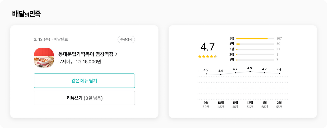 음식 배달 서비스에선 맛과 서비스 품질이 시시각각 달라지는 재화의 특성상 리뷰의 시의성이 무엇보다 중요합니다. 배달의 민족의 UX 전략은 단순히 많은 리뷰를 확보하는 데 그치는 것이 아니라 ‘시간’을 기준으로 정보를 관리해, 실제로 변동되는 서비스 품질을 제공해 소비자들에게는 구매 판단 지표를 제공하고, 가게에는 품질 관리 지표를 제시하는 것입니다.