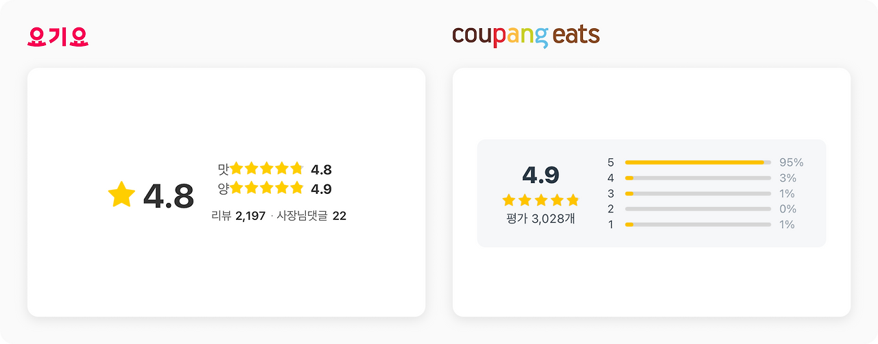 경쟁 서비스의 리뷰 전략을 확인하기 위해 대표적인 경쟁 서비스인 요기요와 쿠팡이츠의 리뷰 컴포넌트와 정책을 살펴보겠습니다.