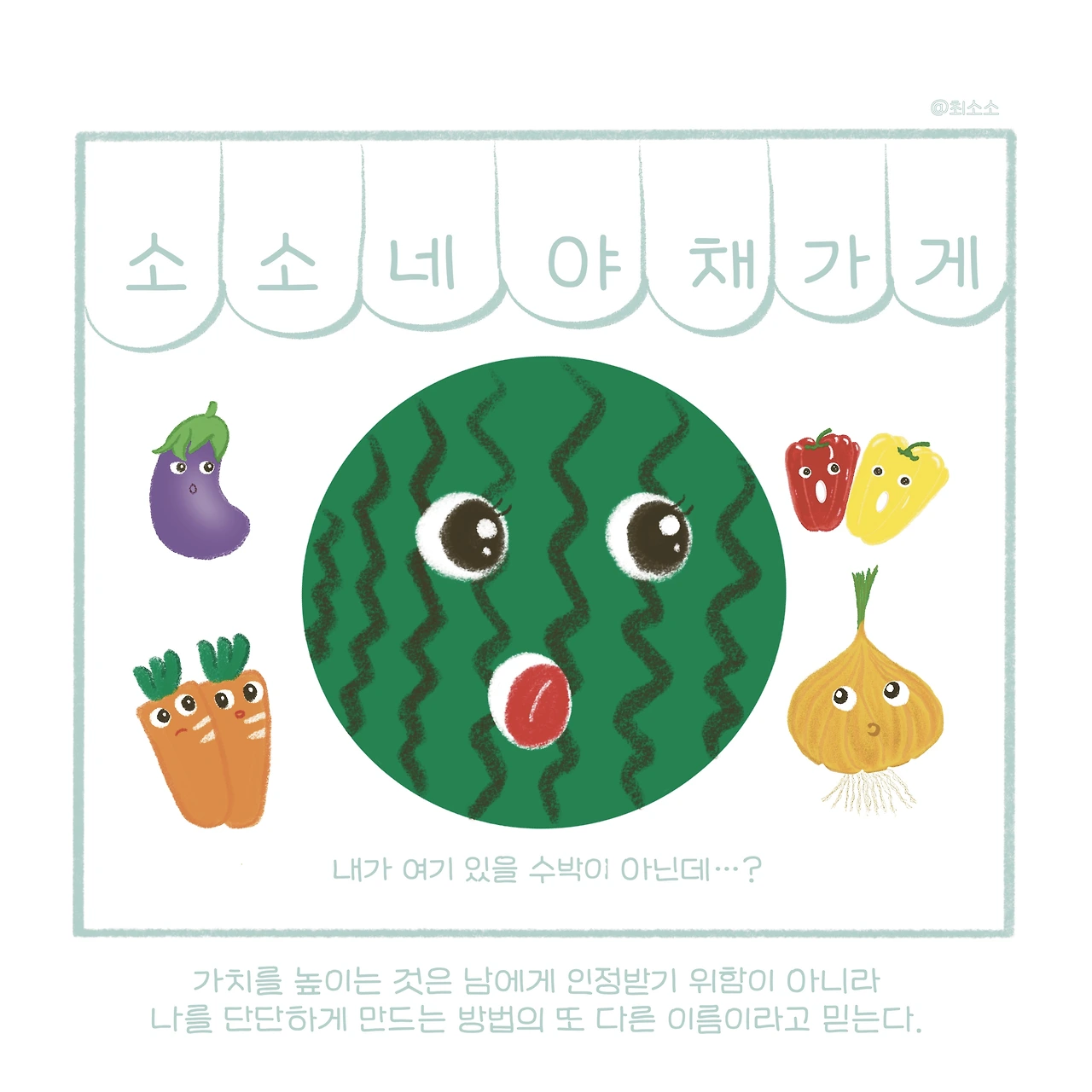 가치나 존재를 탓하기보다 환경의 문제로 판단하고 나를 다른 곳으로 옮기는 것. 그 판단을 하고 결정하기까지, 기저에는 내가 나 스스로를 가치 있다고 인정하는 것이 바탕되어야 한다. 그것을 깨닫고 나면 야채가게에서 과일가게로 옮긴 수박이 그렇게 용감하고 멋져 보일 수가 없다.