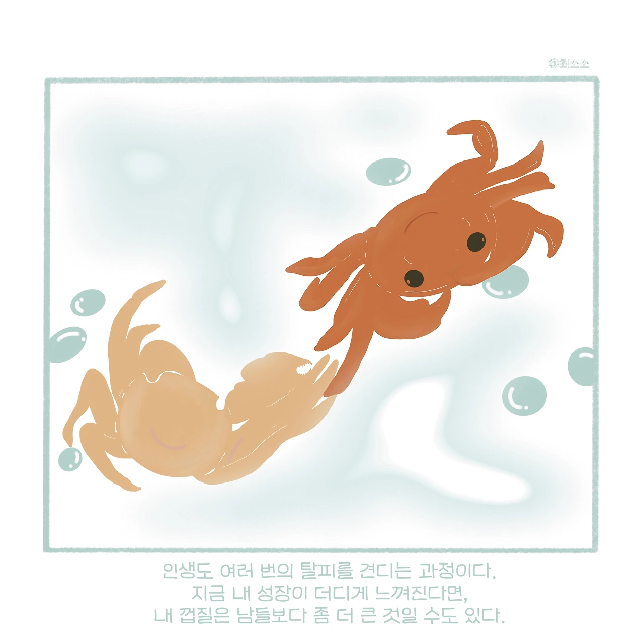 가재든 사람이든 탈피를 견딜 수 있을 만큼 단단하게 성장하고 나서야, 진정한 탈피가 가능해진다. 만약 지금의 상태가 불편하다면 그건 탈피를 향해 부지런히 나를 채워나가고 있는 것이다.