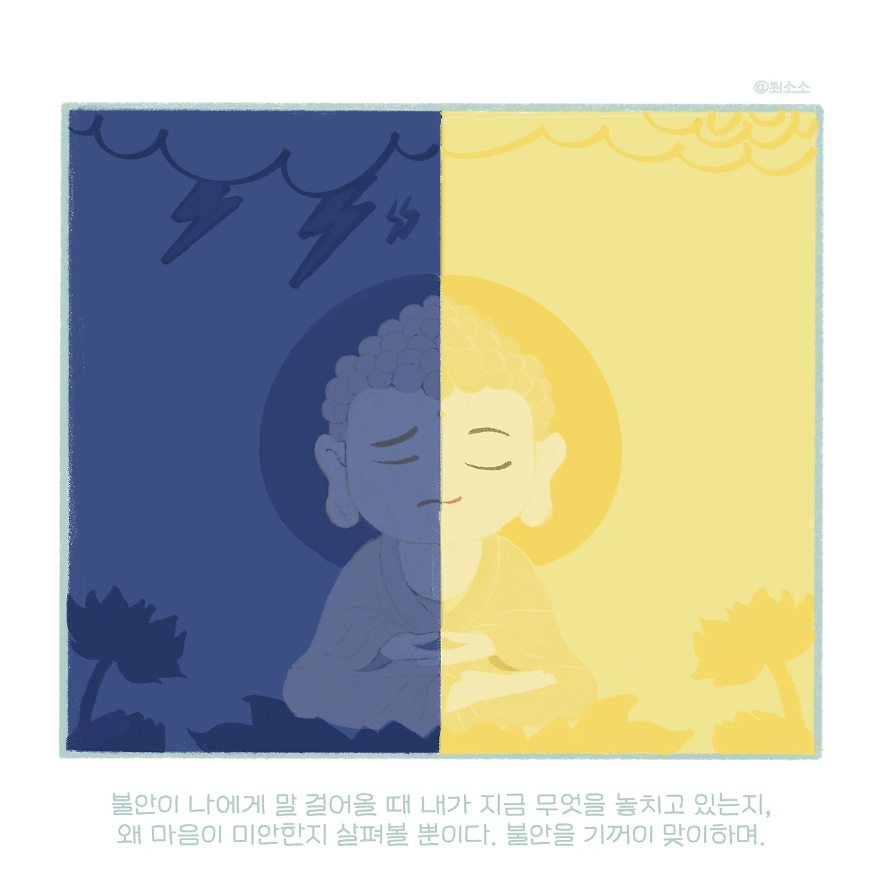 최근에 새로이 알게 된 '불안'의 뜻이 두 가지 더 있다. ‘마음에 미안하다’는 뜻과 불편한 마음의 상태뿐만 아니라 ‘부처의 얼굴’이라는 뜻이 있다는 것이다. 불안(不安)과 불안(佛顔)이 공존하다니. 어쩐지 묘한 위로가 되었다. 하고자 하는 것과 해야 할 것들 앞에서 작아진 내가 어딘가에 있었다. 그런 스스로를 질책할 수밖에 없었던 내가 나에게 분명 미안 해했을 것이다. 불안은 결국 나를 두렵게 하고 가로막기만 한 것이 아니라 미안해하며 성장시키려고 애쓰고 있었다. 어쩌면 내가 지금껏 느낀 불안은 마음에 미안한 불안이 아니었을까. 끼워 맞추는 느낌이 들더라도 정답을 찾아 나가기보다 스스로 만들어가는 것을 택한다. 나의 시행착오와 다른 의미의 불안이 만나 나는 불안과 화해한 듯 도리어 마음이 편안해졌다. 이제 불안은 나에게 두 가지의 얼굴로 다가온다. 하나는 나를 긴장하게 하고 다른 하나는 스스로를 들여다보게 한다. 그저 불안이 나에게 말 걸어올 때 내가 지금 무엇을 놓치고 있는지, 왜 마음이 미안한지 살펴볼 뿐이다. 자비로운 부처의 마음으로 불안을 기꺼이 맞이하며.