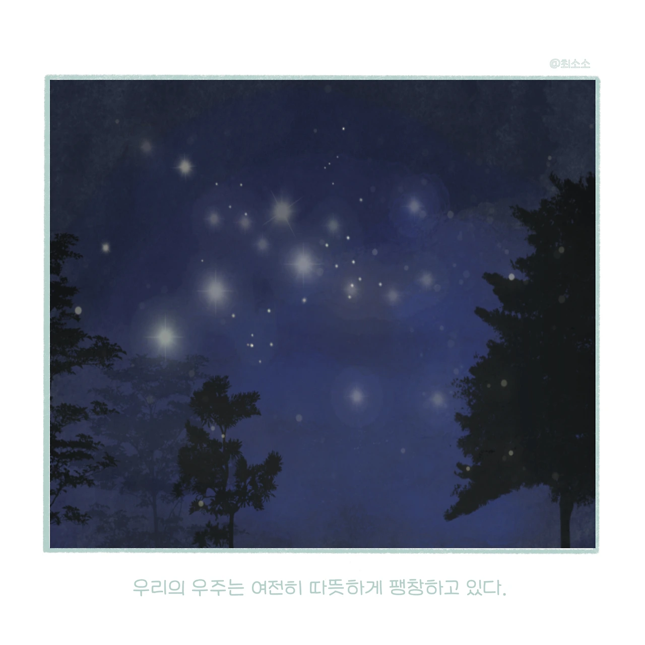 아직 나의 별자리 완성되지 않았다. 여전히 나는 매일 새로운 점을 찍고 때로는 예기치 못한 곳에 발을 딛기도 한다. 하지만 이제는 두렵지 않다. 지금 이 순간의 서툰 발걸음조차 언젠가 내 별자리의 가장 빛나는 축이 될 것임을 믿기 때문이다. 당신의 밤하늘에 빛나고 있는 수많은 점이 혹시라도 무의미해 보인다면 가만히 스스로를 다독여주었으면 좋겠다. 당신이 찍어온 그 모든 점은 하나하나가 소중한 빛이며 당신만이 그릴 수 있는 가장 눈부신 별자리를 위해 꼭 필요한 조각들이라고. 우리의 우주는 여전히, 따뜻하게 팽창하고 있다고 말하고 싶다.