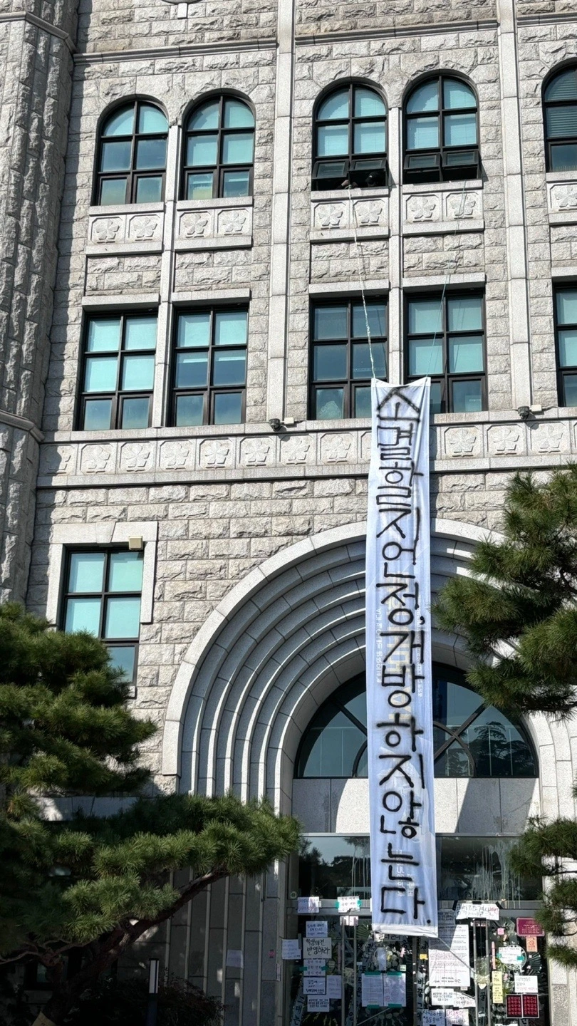 캠퍼스에서 학우를 잃었던 작년, 재학생들은 친일파 동상을 포함해 학교에 대자보를 붙이고 본관을 점거했다. 그리고 그 시위의 끝은 학생 상대로 고소를 하겠다며 협박하고 모두를 쫓아내는 학교의 승리였다. 그리고 지금도 학교는 학생들에게 '작년처럼 평화로운 시위를 하라'고 말한다.