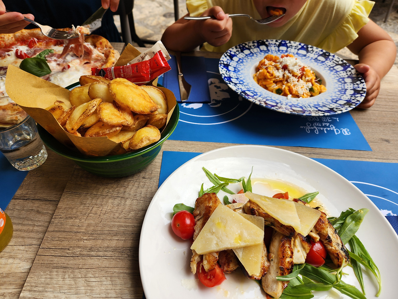 차로 10분 정도 이동하여 미리 봐두었던 주차장에 주차를 했다. 비가 오려고 하는지 하늘이 어두웠다. 이탈리아에 와서 하루 빼고는 매일 날씨가 쾌청했는데 모노폴리에 오자마자 날씨가 꾸물해져서 마음도 꾸물해졌다. 주차장에서 모노폴리 구도심지까지는 도보로 꽤 걸어야 해서 구글지도를 보며 찾아갔다. 구도심지 초입에 자리한 식당의 야외 테이블에 자리를 잡고 피자, 오레끼에떼, 감자튀김, 닭고기를 주문하고 있자니 하늘에서 옅은 비가 흩뿌리기 시작했다. 그래도 다행히 우리 자리엔 머리 위에 차양이 드리워져 있어서 그대로 야외에서 식사를 하기로 했다. 이상하게 파스타와 피자, 감자튀김 등 밖에서 먹는 메뉴가 매일 비슷한데도 질리지 않았다. 조미료나 소스를 최소한으로 넣고 재료 본연의 맛을 중시하는 이탈리아의 조리문화 때문인 것 같았다. 다른 나라에 여행 갔을 때는 여행 중반쯤 되면 현지 음식이 물려서 한국의 맛을 그리워하게 되는데, 그런 걱정을 더 했던 이탈리아 음식이 이렇게 잘 맞을 줄은 몰랐다.