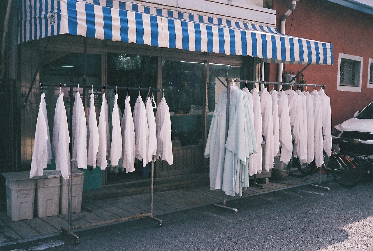 세탁소 앞에 새하얀 옷들이 걸려있는 걸 봤습니다. 와이셔츠처럼 보이기도 하고 조리복처럼 보이기도 하네요. 어쨌든 하얗게 세탁되어 걸린 옷들을 보니 기분마저 산뜻해집니다.