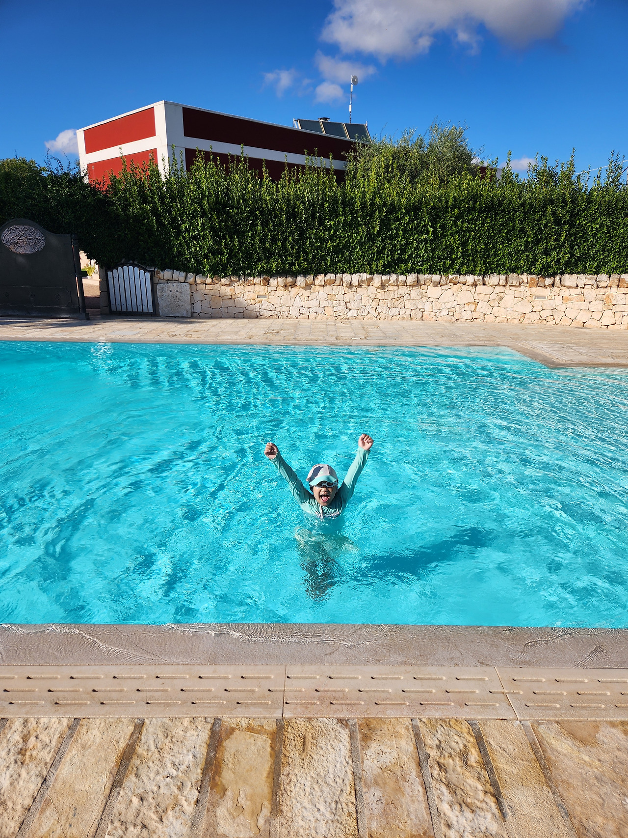 장을 다 보고 숙소로 돌아와 얼른 수영복으로 갈아입고 수영장으로 향했다. 이 숙소는 객실마다 특정 선베드가 배정되어 있는데, 수영장에 갈 때마다 항상 선베드에 누워있는 손님들이 있었다. 이 숙소에서 지내는 동안 수영장에서 계속 봤는데, 낮에는 선베드에서 느긋하게 시간을 때우다가 저녁이 되면 나가는 것 같았다. 가끔 해외 리조트에 갈 때마다 느끼는 데, 외국인들은 보통 수영장에서 정작 수영은 거의 안 하고 선베드에 누워서 책을 읽거나 음료를 마시며 햇빛을 쬐는 걸 좋아하는 것 같다. 방송인 알베르토가 쓴 책에서, 이탈리아에서는 여름이 지나도 피부가 구릿빛으로 타지 않으면 휴가도 못 갔다 왔다며 불쌍하게 본다는 농담을 본 적이 있는데, 아닌 게 아니라 이탈리아에서 다녔던 바닷가에는 항상 선탠을 하며 누워 있는 사람들이 정말 많았다. 우린 어떻게 서든 해를 피하려고 온몸을 감싸는 것과는 대조적이었다. 나도 평소에 얼굴과 팔다리는 검지만(유난히 피부가 검다) 몸만 하얀 게 영 보기 싫었던 터라 이탈리아에서만큼은 바닷가에서 수영복 바지만 입고 맘껏 몸을 태웠다.