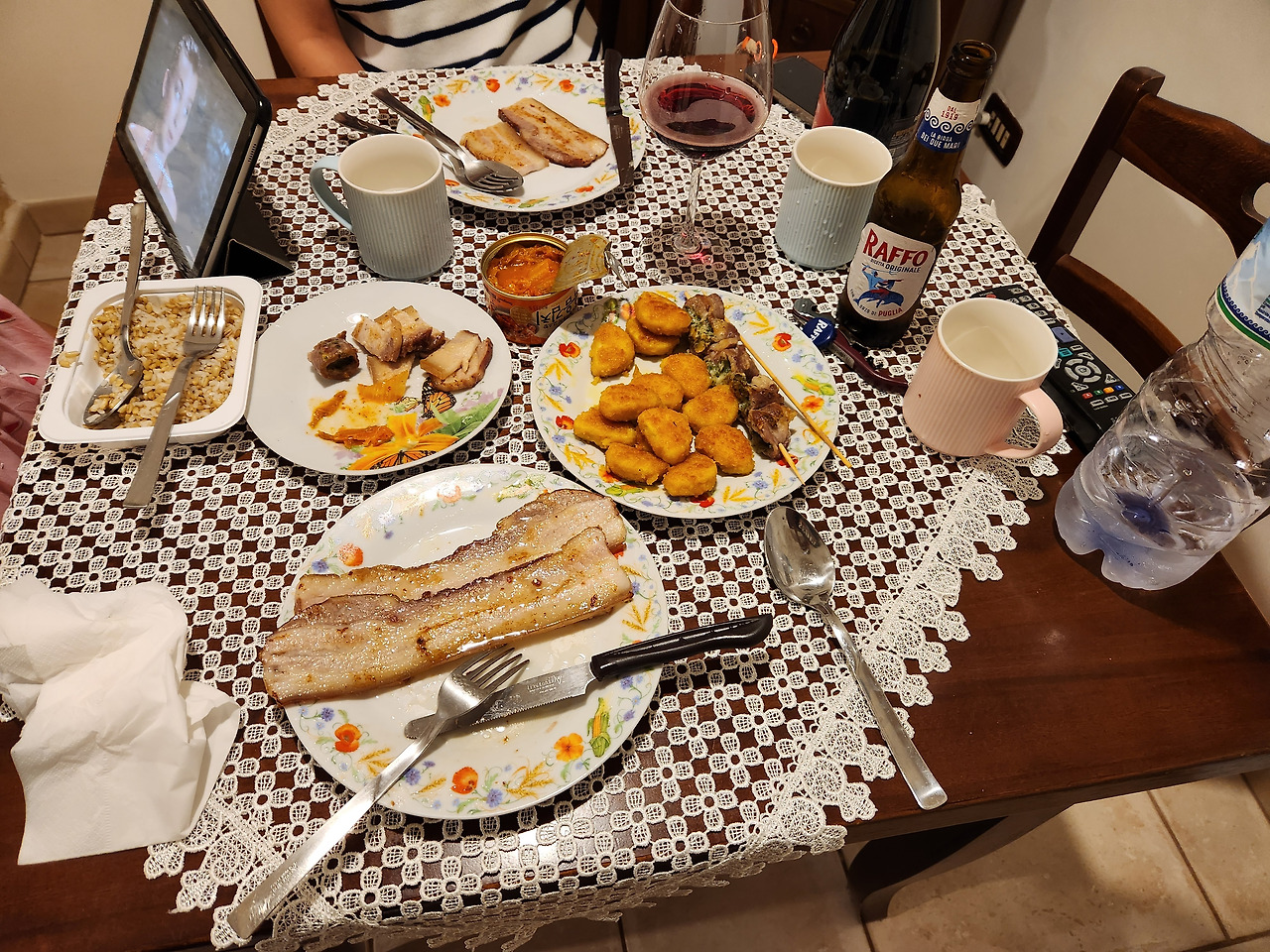 유라가 고양이와 노는 동안 우린 사 온 음식들을 구워서 식탁을 차렸다. 쌈장을 안 가져온 게 너무 아쉬웠지만 한국에서 싸 온 양념김치와 먹으니 맛있었다. 이탈리아 음식이 생각보다 괜찮아서 한국 음식이 그렇게 많이 그립진 않았지만 그래도 삼겹살에 김치에 햇반을 먹으니 가히 진미였다. 같이 사온 너겟과 꼬치도 나쁘지 않았다. 밥을 다 먹고 침대에서 쉬던 유라는 피곤했는지 금방 잠들었고, 아내와 나는 객실 앞 야외 테이블에서 밤하늘을 바라보며 달과 별을 구경을 했다. 이탈리아에서도 시골이라 그런지 별이 정말 잘 보였다.