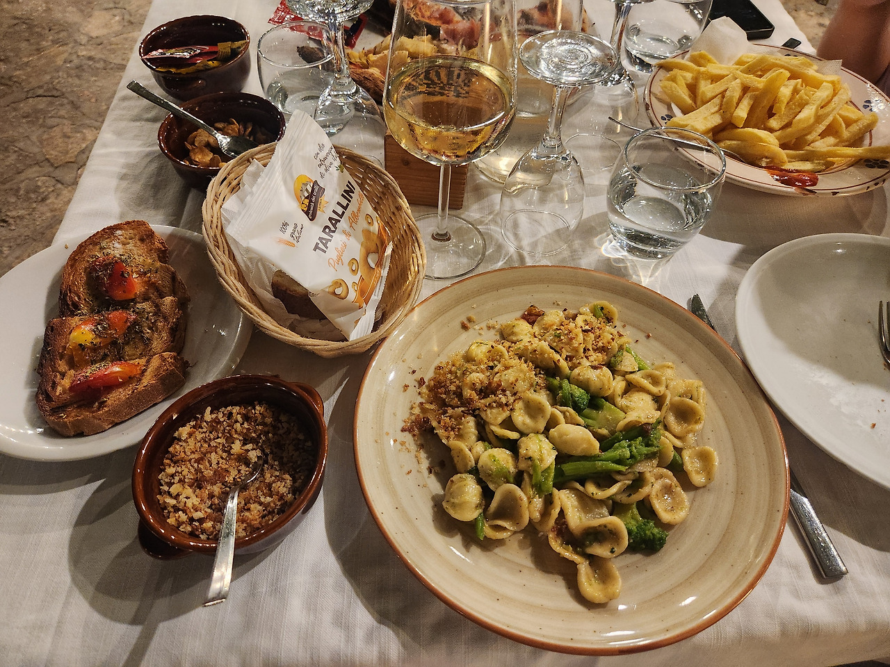저녁은 그저께 트룰리 마을 갔던 날 점심 먹으려고 도보로 가다가 포기했던 숙소 근처 식당에서 먹기로 했다. 차로 5분 정도 가서 식당 앞 골목에 주차를 하고 안으로 들어갔다. 실내와 실외로 꾸며진 꽤 규모가 큰 식당이었는데 이미 자리가 거의 꽉 차있었다. 직원이 나와서 예약했냐고 물어봤다. 그러고 보니 이탈리아 식당은 종류에 따라 반드시 예약을 해야 하는 곳이 있다고 읽은 기억이 났다. 예약 없이 무턱대고 온 걸 후회하며 예약은 안 했다고 대답하자 직원이 약간 곤란해하는 눈치로 잠시 기다리라며 안으로 다시 들어갔다. 잠시 후 좀 더 높아 보이는 아저씨가 나와서 괜찮으니 안으로 들어오라고 하며 우릴 안내했다. 조그만 정원을 지나 계단을 올라가니 멋진 야외석이 나왔다. 우린 그곳에 자리를 잡고 찬찬히 메뉴를 훑어봤다. 이탈리아에 와서 피자를 아직 한 번도 안 먹은 우린 햄과 버섯이 올려진 피자와 감자튀김을 주문했고 유라는 역시나 오레끼에떼를 주문했다. 한국에 있을 때도 파스타를 곧잘 먹긴 했지만 이렇게까지 잘 먹을 줄은 몰랐다. 이렇게 오레끼에떼는 유라의 소울푸드가 되는 것인가. 차 때문에 술을 못 먹는 나를 대신해 아내가 화이트 와인을 주문했다. 이때 직원이 비앙코 뭐라고 했는데 전혀 알아들을 수 없었던 우린 그냥 고개만 주억거렸다. 직원이 가고 나서 검색해 보니 화이트 와인과 레드 와인 중 뭘 먹을 거냐고 물어본 거였다. 우리가 비앙코에서 끄덕거렸더니 역시나 화이트 와인이 나왔다. 아내에게 물어보니 맛이 꽤 좋다고 했다. 잘 못 시켰으면 어쩌나 했는데 다행이었다.