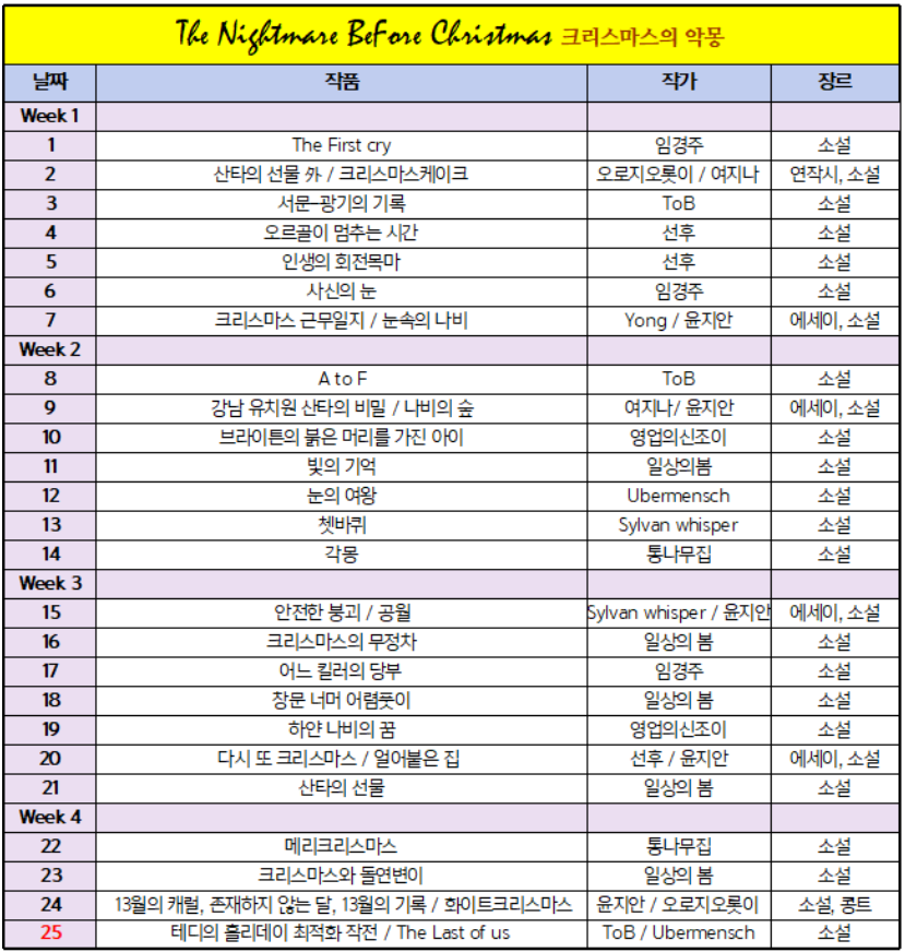# 작품은 12월 1일부터 25일까지 아래의 순서로 공개될 예정입니다.