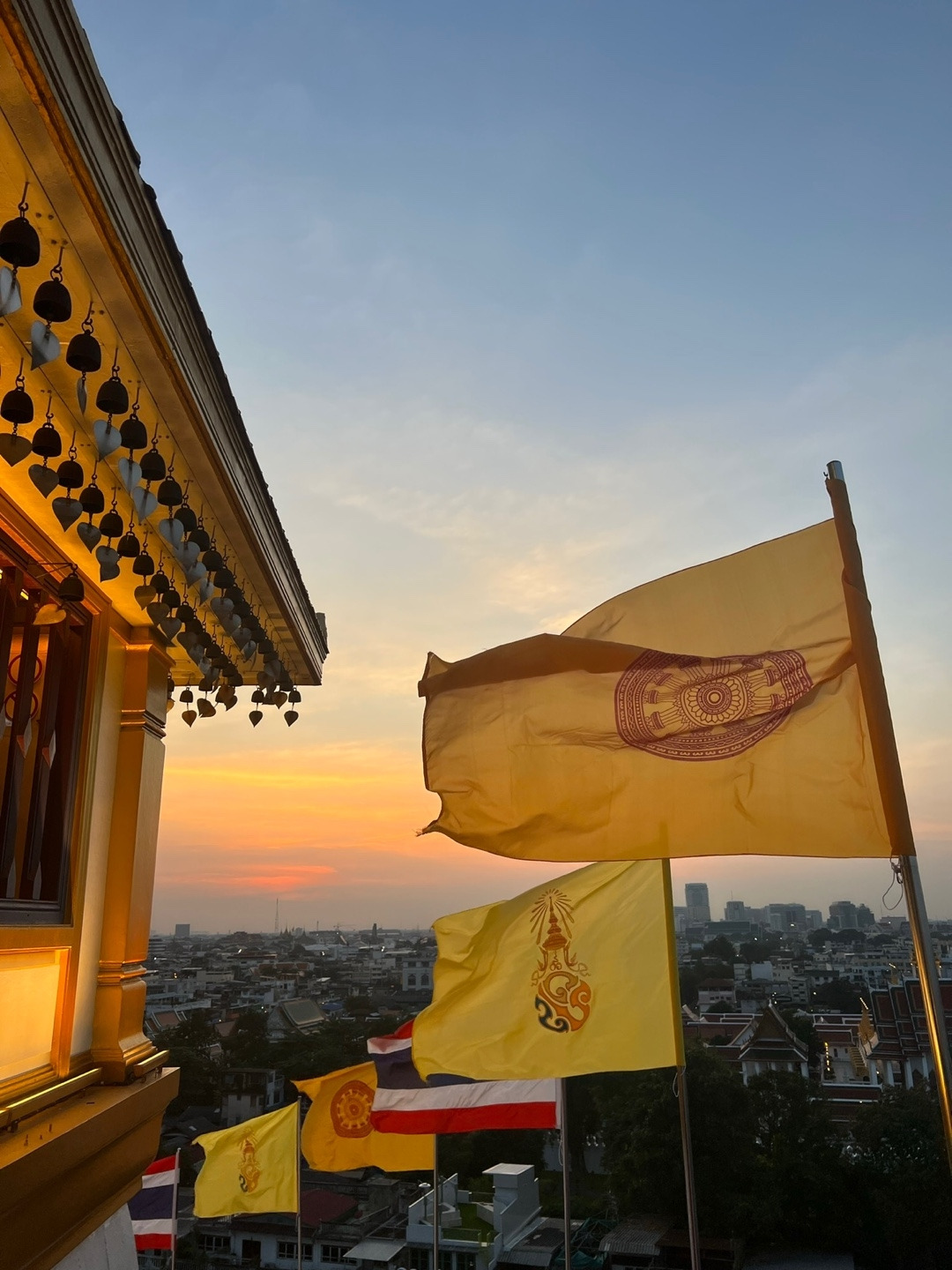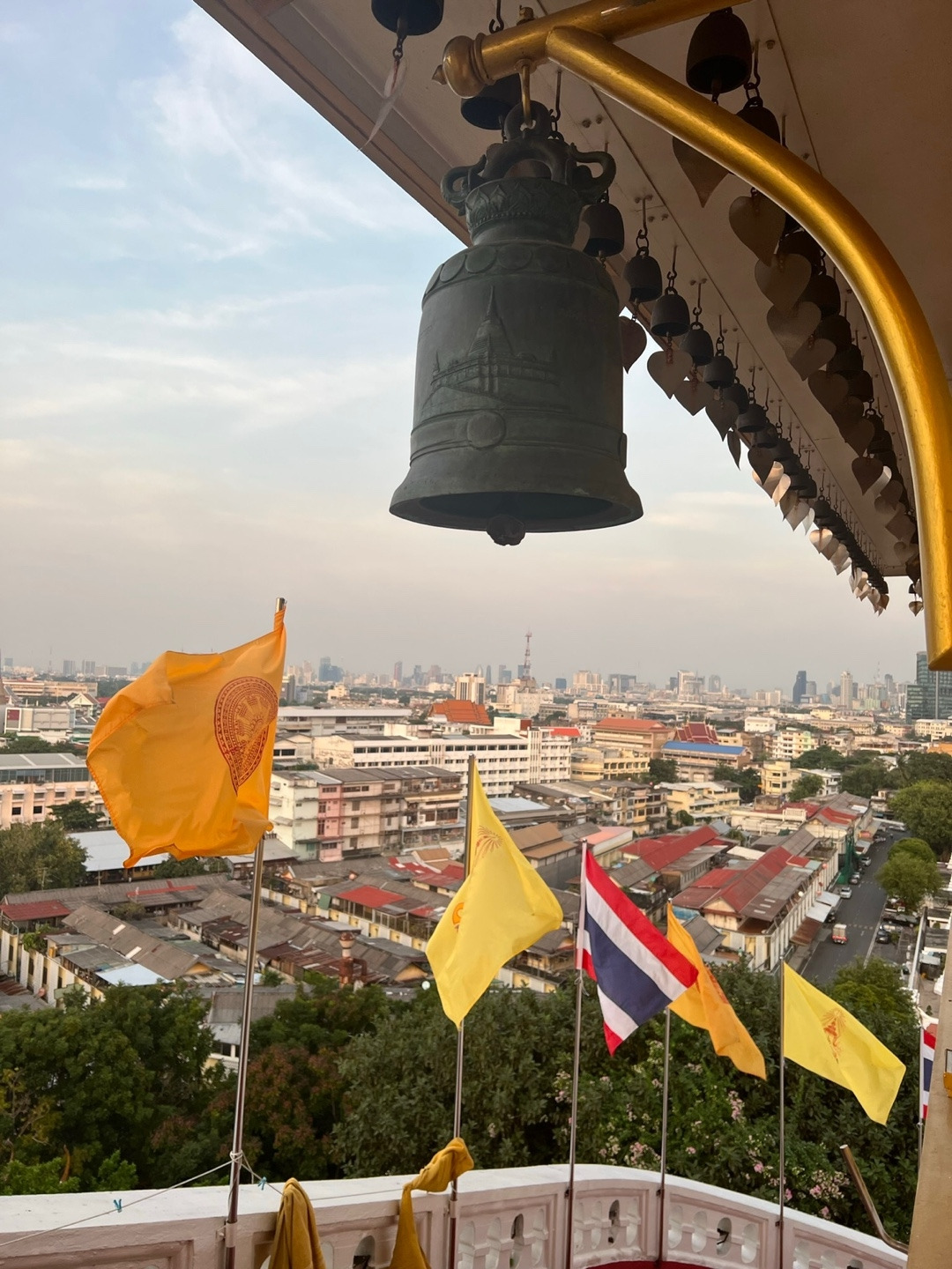 오늘 하루는 아예 사원들을 다 둘러보기로 마음먹은 날이었다. 가는 길에 물을 10 바트 주고 산 다음, 바로 '왓 싸켓'으로 걸어갔다. 황금산이라고도 불리는 이곳은 일몰에 맞춰서 가면 정말 멋진 풍경을 볼 수 있다고 해서 일부러 저녁 시간대에 가려고 했던 곳이다. 계단을 오르고 올라서 황금산 꼭대기에 도착하자 굉장히 큰 창문이 있었다. 큰 창문을 통해 일몰을 지켜볼 수 있었는데 정말 아름다웠다. 20분 정도 앉아서 일몰을 바라보다가 천천히 지는 해를 보며 내려왔다.