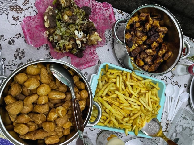 음식은 감자튀김, 빵, 도넛, 구운 닭고기, 구운 염소고기, 바나나 빵(바나나 플란텐 banana plantain이라고 불리는 아프리카 음식이다. 바나나를 썰어서 튀긴 음식인데 빵 같고 생각보다 맛있다), 맥주, 음료수, 감자칩 등이 있었다. 미리 만들어둔 음식을 사람들이 적당히 모이고 난 뒤, 각자 먹고 싶은 만큼 덜어가서 먹기 시작했다. 아쉽게도 이 날 저녁을 미리 먹고 가서 많이 먹지는 못했다. 케이크를 자르기 전까지 나는 생일 주인공인 꼬마와 사촌 아이들과 열심히 놀아줬다. 한국에서 사촌 동생들을 놀아주던 실력이 발휘된 순간이었다. 여기서는 까쉬까쉬라고 부르는 숨바꼭질도 하고 무궁화 꽃이 피었습니다를 가르쳐줬다. 아이들에게 몇 번 무궁화 꽃이 피었습니다를 알려줬더니 곧바로 똑 부러진 발음으로 무궁화 꽃이 피었습니다를 따라 했다. 아이들의 습득력이란! 다 같이 숨바꼭질을 하다가 위험하니까 뛰지 말라는 어른들의 말에 다 같이 모여 앉아서 미용실 놀이도 하고 과자도 먹었다.