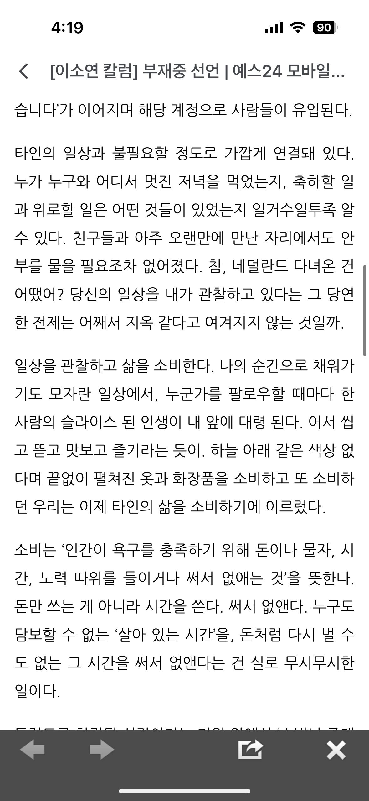 <옷을 사지 않기로 했습니다>의 저자 이소연 작가님이 채널예스에 기고한 글을 보고 인스타그램 어플을 지웠다. 아예 인스타그램을 하지 않겠다고 선언할 수는 없지만(지금도 이 글을 업로드하고 있으니..), 적어도 무의식적으로 타인의 삶을 소비하며 내 삶을 놓치는 시간은 줄여보기로 한다. 기록 또는 레퍼런스 서치 등 진짜 필요할 때만 사용하도록 한다. 안 그래도 짧은 인생, 나 자신에게 집중하기도 모자란 시간이다. 그 시간에 차라리 책을 읽거나 운동을 하자! 디지털 디톡스를 시작한 이후 스크린타임이 1시간 내외로 나오고 있어서 놀랍다..!