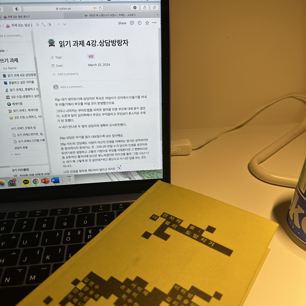 글쓰기 수업의 읽기/쓰기 과제가 생각보다 많아서, 3월은 과제를 하느라 다 가버린 달처럼 느껴지기도 한다. 수업을 듣느라 바쁘긴했지만 절대 후회는 없다. 이 수업을 통해서 얻고 배운 것들이 정말 많다. 이토록 안전하고 따뜻하고 다정한 글쓰기 수업이 있다니! 왜 이제야 들었나 하는 생각도 들고, 이제라도 용기내어 들어보길 정말 잘 했다는 생각도 든다. 이에 대한 자세한 소감은 수업이 끝난 4월에 다시 쓰기로 한다.