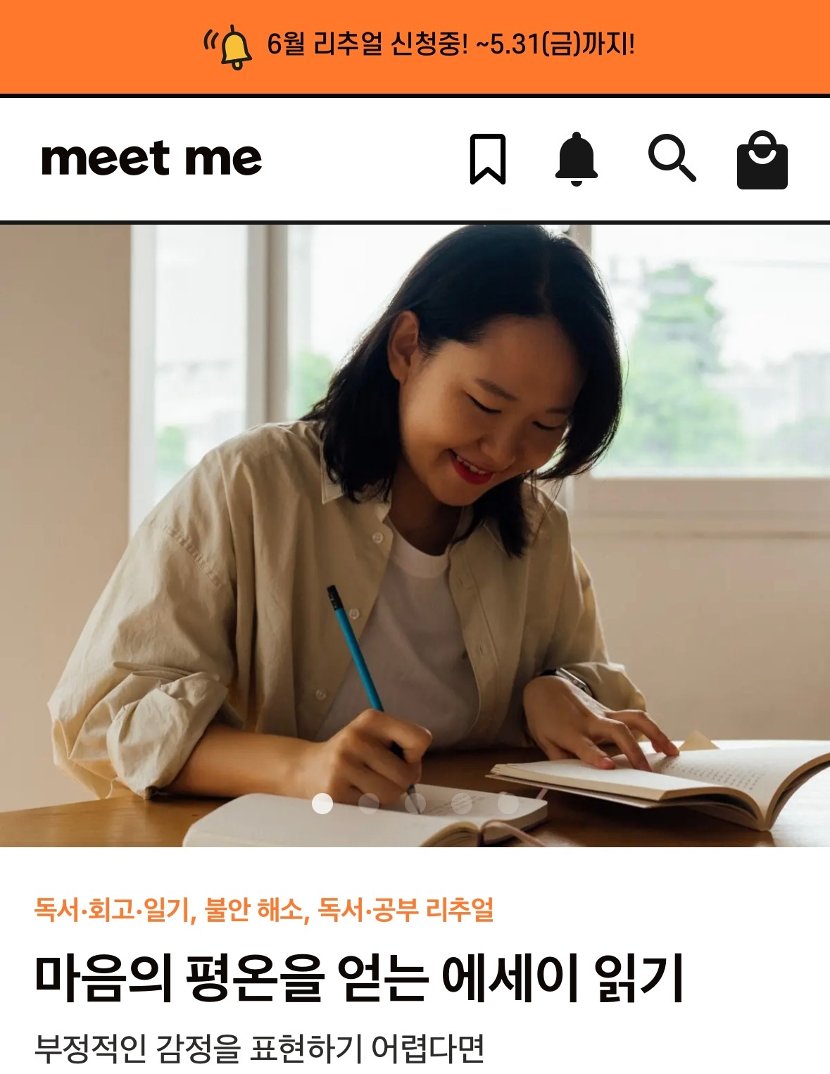 늘 마음의 평온을 유지하기 위해 에세이를 곁에 두고 읽는 시간을 다른 사람들과 함께 나누고 싶어, 밑미에서 <마음의 평온을 얻는 에세이 읽기> 리추얼을 기획했다. 부디, 이 시간들이 나와 모두에게 평온을 가져다 주는 안전한 시간이 되기를! 그거면 충분할 것 같다.