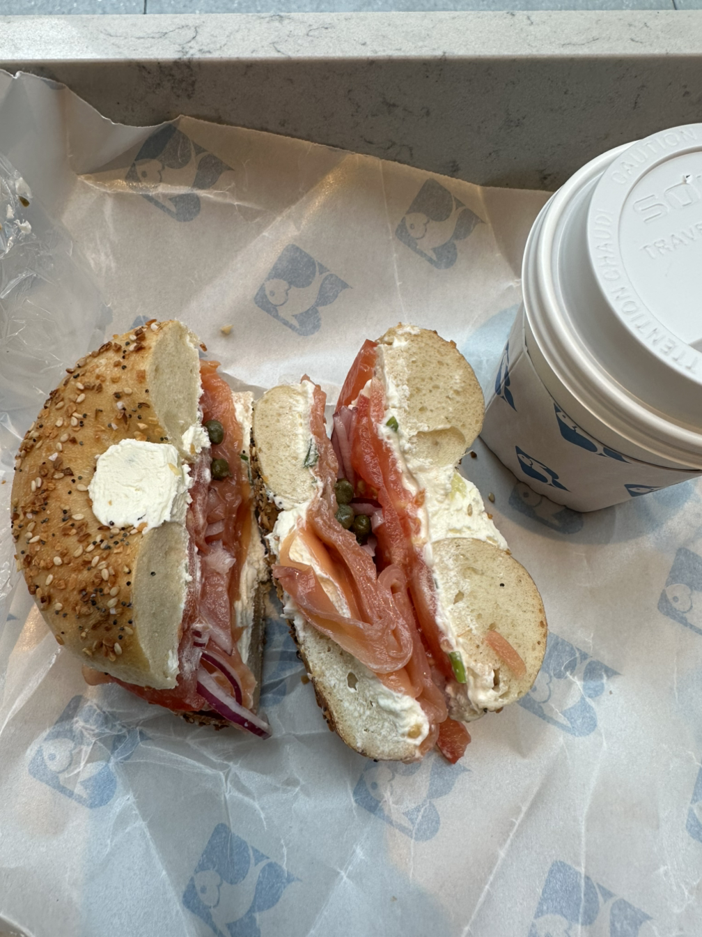뉴욕 베이글은 베이글 자체가 맛있어서 유명한걸까? 안에 들어가는 토핑이 다양해서 유명한걸까? 늘 궁금했다. 뉴욕 첫끼로 먹은 연어 베이글! 먹자마자 헐.. 진짜 맛있다! 라고 속으로 외쳤다. 아무래도 토핑이 다양해서 유명한 쪽이 맞는 것 같다. 베이글에 끼워먹는 염장 생선, 염장 고기들이 이민자들의 문화에서 온거라고 하니까. 바빠서 베이글 샌드위치로 끼니를 해결하는 도시의 문화 + 다양한 민족이 섞인 식문화가 합쳐져서 유명해진 것 아니려나