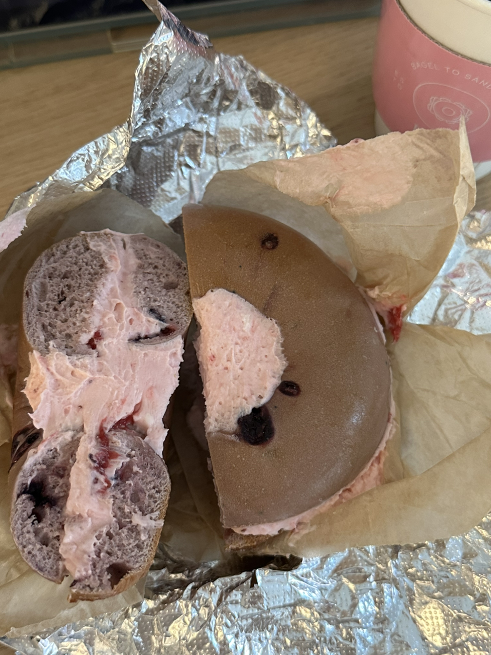 오늘의 아침은 베이글! 다이너와 베이글을 하루씩 번갈아가면서 먹어보고 있다. 베이글은 연어 베이글, 햄치즈 베이글처럼 재료가 풍부한 걸 시도해보다가 오늘은 블루베리 베이글에 딸기 크림치즈를 바른 심플한 조합을 먹어봤다. 미국은 베이글도 양이 많아서, 재료가 풍부한 조합은 내가 반밖에 못 먹기도하고 심플하게 먹었을 땐 어떤 맛일지 궁금하기도 했다. 그리고 크림치즈 종류가 매-우 다양해서 크림치즈만 여러개 시도해봐도 재밌을 것 같았다. 오늘의 조합은 대성공!